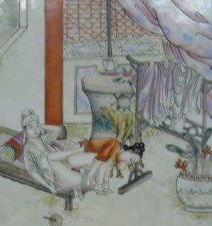 "素女"指房中术《素女经》。将春宫画与小姐观看的习惯,在中国古典文学中也有描写。唐代诗人白行简《天地阴阳交欢大乐赋》就说到《素女经》画册。清代李渔《肉蒲团》中的未央生,为了陶养一位如泥朔木雕、毫无生趣的绝色女子,"到书画铺买幅绝精绝巧的春宫册子,是本朝学士赵子昂的手笔,共有三十六套,唐诗上三十六宫都是春色的意思,拿去放在闺阁之中,好与玉香小姐共同翻阅。"可见在中国古代,春宫图的作用之一是作为进行性教育的媒介。除此以外,春宫图还作为"避火图"、"护书"和"嫁妆画"在民间大量流行。明、清两代,天津杨柳青等地的一些妇女每年春节前将春宫画当做年画销售,这就是有名的"女儿春"。